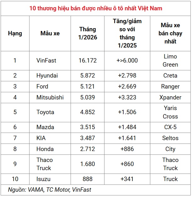 Trong khi vị trí dẫn đầu không thay đổi, thì các vị trí tiếp theo xáo trộn mạnh. Hyundai bất ngờ vươn lên trở thành thương hiệu bán nhiều ô tô thứ 2 tại thị trường Việt Nam, cho dù lượng xe tiêu thụ giảm 12,4% so với tháng 12/2025, nhưng lại tăng 91% so với tháng 1/2025. Hai mẫu Creta và Tucson đóng góp lớn nhất vào doanh số bán xe của Hyundai trong tháng 1/2026.