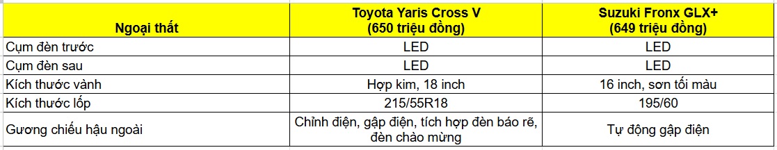 Dưới đây là bảng so sánh thông số và trang bị của Toyota Yaris Cross V Suzuki Fronx GLX+