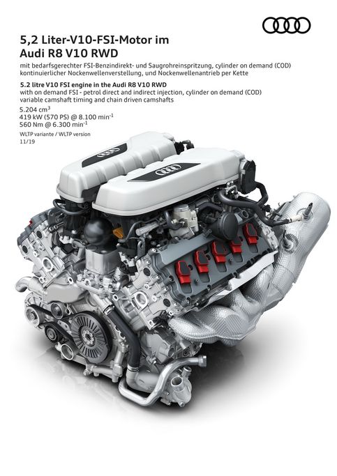 "Trái tim" của Audi R8 RWD 2020 là khối động cơ V10 5.2L hút khí tự nhiên với sức mạnh đầu ra đạt 532 mã lực và 540 Nm mô-men xoắn cực đại. Đi kèm với đó là hộp số S-Tronic 7 cấp. Từ đó, siêu phẩm sử dụng hệ dẫn động cầu sau này có thể tăng tốc từ 0 - 100 km/h trong 3,7 giây trước khi đạt vận tốc tối đa 320 km/h. Đó là thông số kỹ thuật của bản Coupe, đối với bản Spyder sẽ tương tự như vậy nhưng có thời gian tăng tốc chậm hơn 0,1 giây và vận tốc tối đa chỉ 318 km/h.