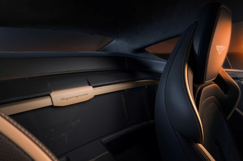 Phía sau ghế là khoang chứa đồ bọc da kết hợp ốp sợi carbon. Nhiều chi tiết trong nội thất được hoàn thiện bằng carbon hoặc nhôm tùy chọn. Logo Supersports xuất hiện trên bệ bước, trong khi bảng số thứ tự của từng chiếc xe được đặt ở khu vực trung tâm. Bộ phận Mulliner tiếp tục cung cấp hàng trăm tùy chọn cá nhân hóa để mỗi khách hàng có thể tạo nên một chiếc xe mang dấu ấn riêng.