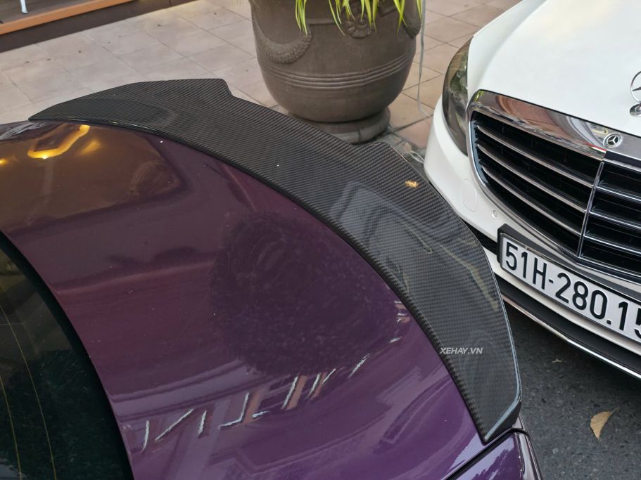 Điểm thu hút ánh nhìn đầu tiên chính là màu sơn ngoại thất Purple Silk Metallic đầy quyền lực. Chỉ riêng màu sơn này đã tiêu tốn của chủ xe 320 triệu đồng, tương đương với giá trị của một chiếc xe điện VinFast VF 3. Diện mạo của xe càng trở nên hầm hố hơn nhờ hàng loạt chi tiết bằng sợi carbon từ cản trước, cản sau, vỏ gương cho đến nẹp sườn.