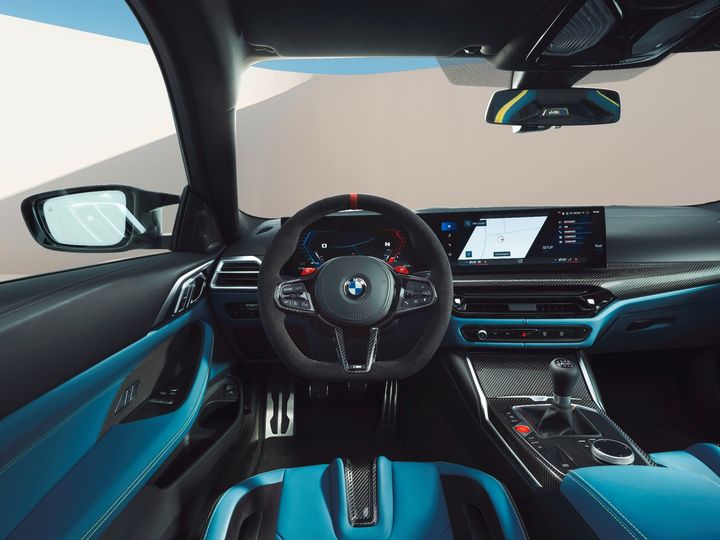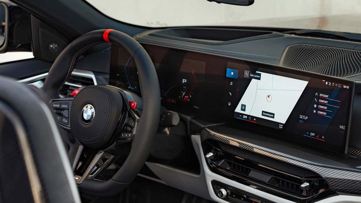 Những nâng cấp đáng kể hơn nằm ở phía bên trong khoang nội thất. Tại đây, xe được trang bị vô lăng đáy phẳng mới, bảng điều khiển bọc da tổng hợp Sensatec và các chi tiết trang trí mới. Không chỉ vậy, xe còn có cụm đồng hồ kỹ thuật số 12,3 inch và màn hình giải trí cảm ứng 14,9 inch đi kèm hệ điều hành iDrive 8.5 mới nhất. Live Cockpit Professional cũng là trang bị tiêu chuẩn trên BMW M4. Hệ thống này bao gồm màn hình HUD và bản đồ vệ tinh BMW Maps.