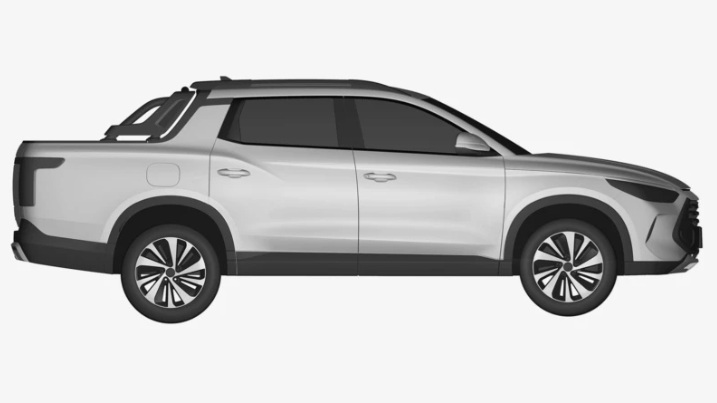 Dựa trên hình ảnh đăng ký tại EUIPO, có thể thấy mẫu xe được phát triển trên khung liền (unibody), khác với cấu trúc body-on-frame truyền thống ở các mẫu bán tải cỡ lớn. Phần đuôi của bán tải mới được tạo hình gọn gàng với thùng hàng ngắn, phong cách tương tự Hyundai Santa Cruz hay Farizon FX của Geely. Cụm đèn hậu đặt ngang kéo dài hết chiều rộng đuôi xe, nối liền bằng một dải LED mảnh. Xe còn được trang bị ốp viền nhựa quanh thân, thanh giằng thùng, giá nóc và camera lùi. Nắp bình xăng bố trí phía sau bên phải, trong khi cổng sạc điện đặt ở vị trí đối xứng bên trái, gợi ý hệ truyền động lai điện.