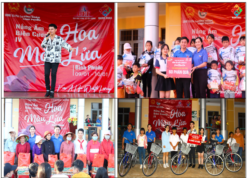 Bên cạnh đó, ngày 09, 10/01, một số doanh nghiệp TP. HCM đã hỗ trợ 80 triệu đồng để CLB Warm Hugs - ĐH Kinh tế Tài chính (TP. HCM) thực hiện Chương trình “Nắng ấm biên cương IV - Hoa màu lửa” tại xã Phú Sơn (huyện Bù Đăng); qua đó, hàng trăm học sinh và người dân đã tham gia sân chơi dân gian, lễ hội ẩm thực, giao lưu văn nghệ, 60 phần quà (01 balô và 02 lốc sữa hộp giấy/ phần) và 5 xe đạp được tặng cho học sinh khó khăn, 50 phần quà cùng 20 học bổng (500 nghìn đồng/suất) được trao cho người dân và học sinh vượt khó.