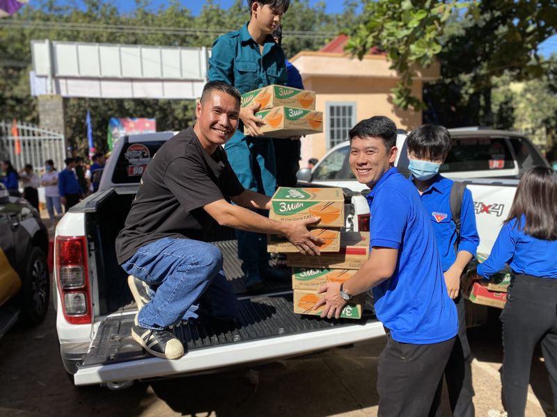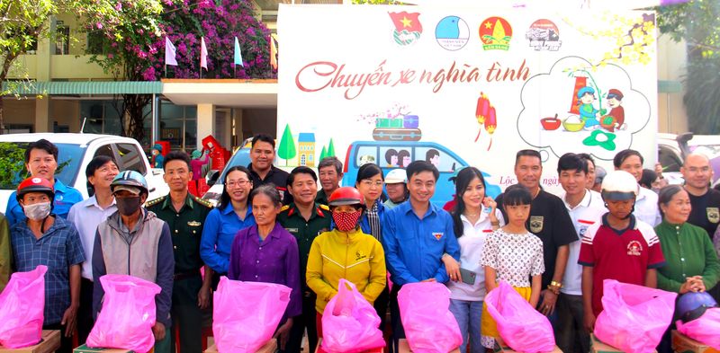 Nhiều phần quà Tết đượm nghĩa tình được Bí thư Tỉnh Đoàn Trần Quốc Duy (áo Thanh niên Việt Nam, chính giữa) cùng CLB Xe bán tải