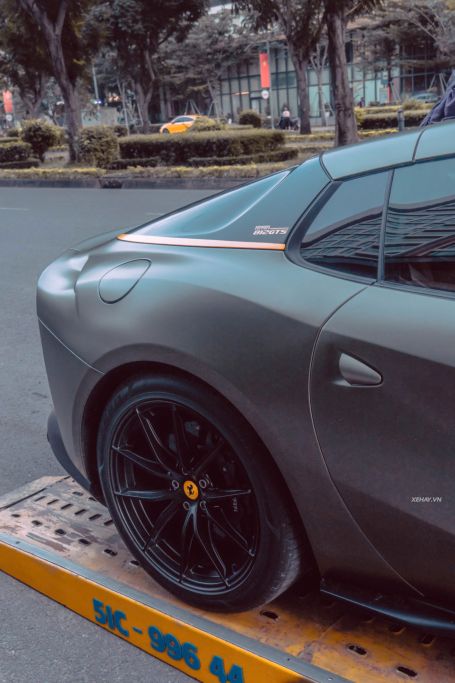 Chiếc Ferrari 812 GTS tại Việt Nam mang lớp sơn Matt Verde Masoni Metallic - sắc xanh nhám hiếm gặp, thể hiện rõ cá tính và gu thẩm mỹ của chủ nhân. Gần đây, xe còn được dán decal trang trí thêm hai sọc đen – vàng ở nắp capo theo phong cách của 812 Competizione làm cho tổng thể xe càng nổi bật hơn.