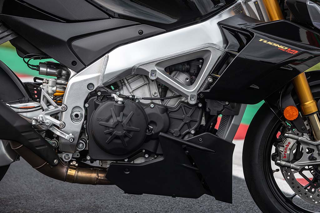 "Món đặc sản" khiến Tuono V4 trở thành chiếc Naked thể thao đặc biệt nhất chính là khối động cơ V4 65° trứ danh từ Veneto: Công suất 175 mã lực và mô-men xoắn 121 Nm đại diện cho sức mạnh thống trị phân khúc. Đi kèm với khối động cơ V4 1.077cc, xe được trang bị tiêu chuẩn hệ thống treo bán chủ động Öhlins Smart EC 2.0 đem lại khả năng cân bằng đáng kinh ngạc.