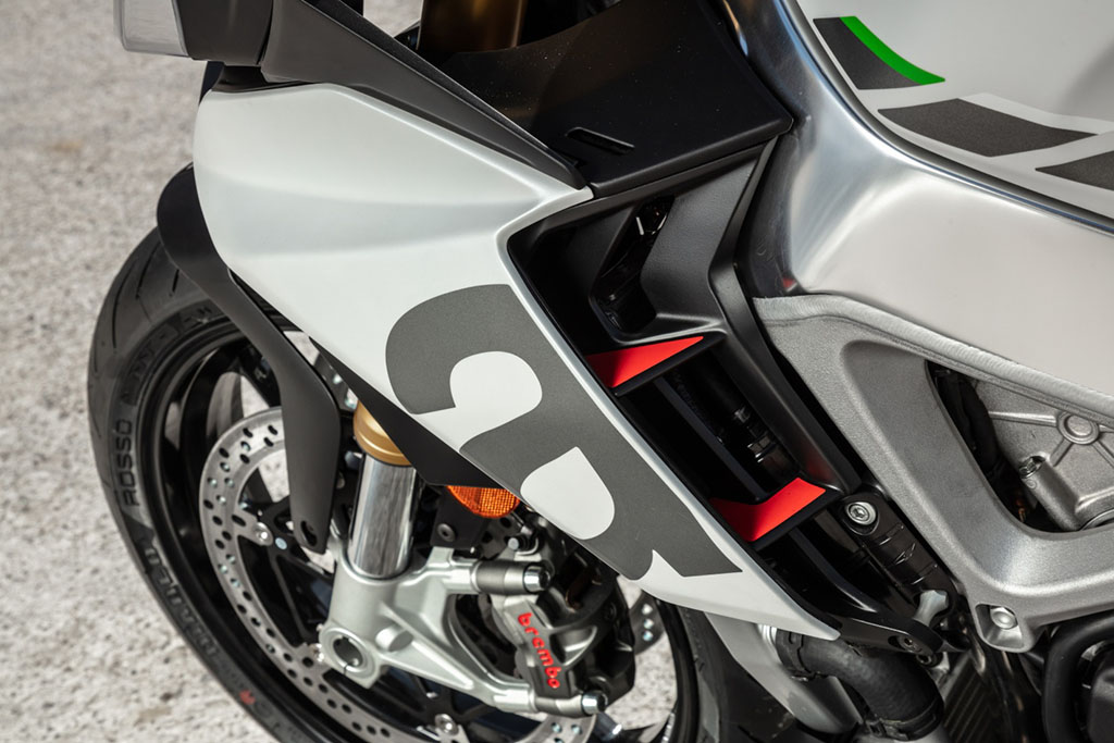 Ngoài ra, xe còn có phiên bản Tuono V4 với 2 tuỳ chọn phối màu gồm Xám Tarmac Grey và Trắng Glacier White. Chủ xe có thể trang bị thêm phụ kiện cặp giá đựng đồ bất đối xứng theo ý muốn.