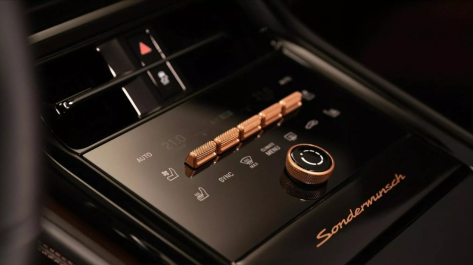 Chủ nhân chiếc xe cũng đưa ra một loạt yêu cầu đặc biệt khác. Trong đó nổi bật là hộp giữ ẩm xì gà làm từ gỗ tuyết tùng tích hợp vào bệ tỳ tay trung tâm, giúp duy trì độ ẩm lý tưởng cho những điếu xì gà cao cấp. Ở hàng ghế sau, Porsche bố trí thêm một ngăn làm mát champagne có ánh sáng nội thất, nâng trải nghiệm xa hoa lên một đẳng cấp khác. Khoang hành lý của xe được bọc da hoàn toàn, kết hợp các chi tiết kim loại màu đen và điểm nhấn Avium Metallic, tạo nên sự thống nhất trong phong cách thiết kế.
