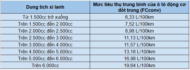 Theo bảng công bố, các mẫu xe có dung tích xi lanh từ 1.500cc trở xuống có mức tiêu thụ xăng trung bình 6,33 lít/100 km. Chỉ số này tăng dần theo dung tích động cơ và đạt mức cao nhất 19,64 lít/100 km với các xe có dung tích trên 6.000cc.