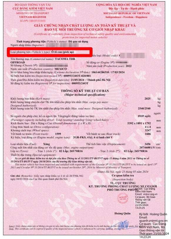 Ngược lại, ô tô tải Pickup được phân loại là dòng ô tô tải thông dụng theo các tiêu chuẩn quy định tại Mục 3 và Mục 4, Phụ lục IV của Thông tư 53. Điểm khác biệt cốt lõi của nhóm này nằm ở các thông số kỹ thuật liên quan đến tỉ lệ giữa khối lượng chở hàng và khối lượng chở người. Thông thường, các dòng xe này có thiết kế thùng hàng lớn hơn và phục vụ chủ yếu cho mục đích vận chuyển hàng hóa nhưng vẫn đảm bảo khả năng di chuyển linh hoạt của một chiếc bán tải.