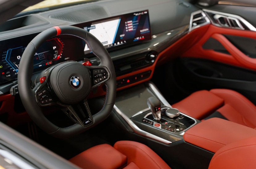 Không gian nội thất của chiếc M4 Competition LCI này là sự hòa quyện giữa sang trọng và phấn khích với da Merino màu đỏ Fiona phối đen. Điểm nâng cấp đáng giá nhất bên trong khoang lái chính là hệ thống màn hình cong đồ sộ, kết hợp giữa đồng hồ kỹ thuật số 12,3 inch và màn hình giải trí 14,9 inch chạy hệ điều hành iDrive 8.5 mới nhất. Vô-lăng cũng được làm mới với thiết kế đáy phẳng và vạch đỏ định hướng ở góc 12 giờ, mô phỏng phong cách xe đua chuyên nghiệp.