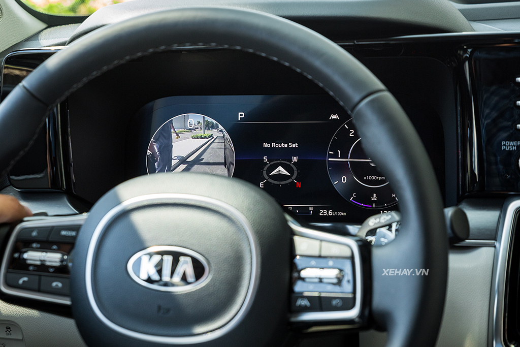 Cụm đồng hồ LCD sau vô lăng cũng là một điểm cộng lớn của Sorento All New. Chi tiết này có độ sắc nét tuyệt vời, gần như không khác biệt so với đồng hồ Mercedes hay BMW. Cụm đồng hồ điện tử này cũng có nhiều giao diện khác nhau tùy theo chế độ lái bạn chọn (Smart, Eco, Sport, Normal). Đặc biệt hơn, khi bạn xi nhan trái hoặc phải thì vòng đồng hồ tương ứng cũng sẽ chiếu hình ảnh từ camera trái hoặc phải, rất thông minh và tiện dụng. Hệ thống camera 360 cũng rất nét, có lẽ chỉ kém Mercedes một chút.