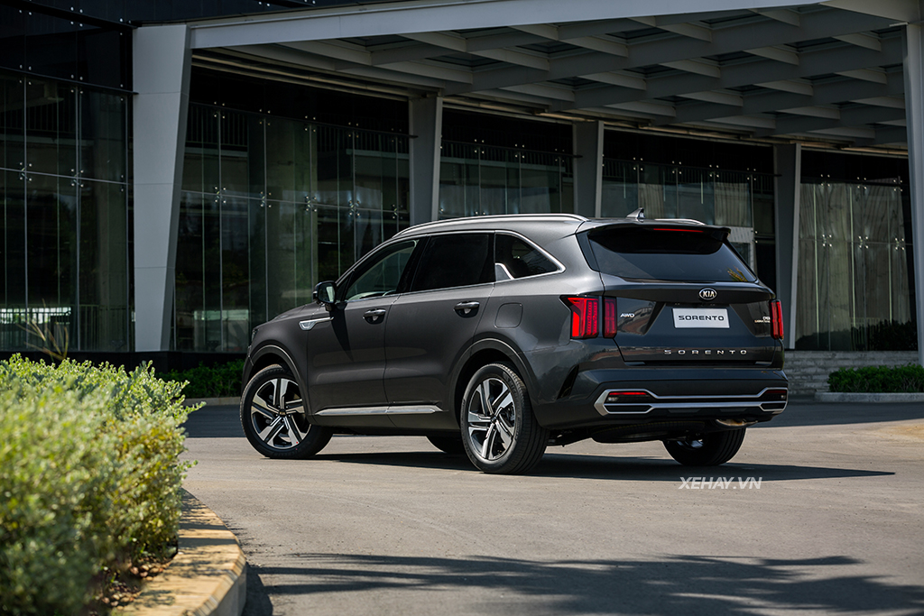 Nổi bật nhất ở phần đuôi xe là cụm đèn hậu nằm dọc lấy cảm hứng từ mẫu Telluride và các đường gân nhấn nhá dứt khoát quanh xe. Có một chi tiết rất thú vị là Sorento sử dụng cần gạt sau ẩn dưới cánh gió thay vì loại đặt ở mép dưới kính sau. Đây là thiết kế giống với các mẫu Range Rover, làm phần đuôi xe gọn gàng và sang trọng hơn nhiều.