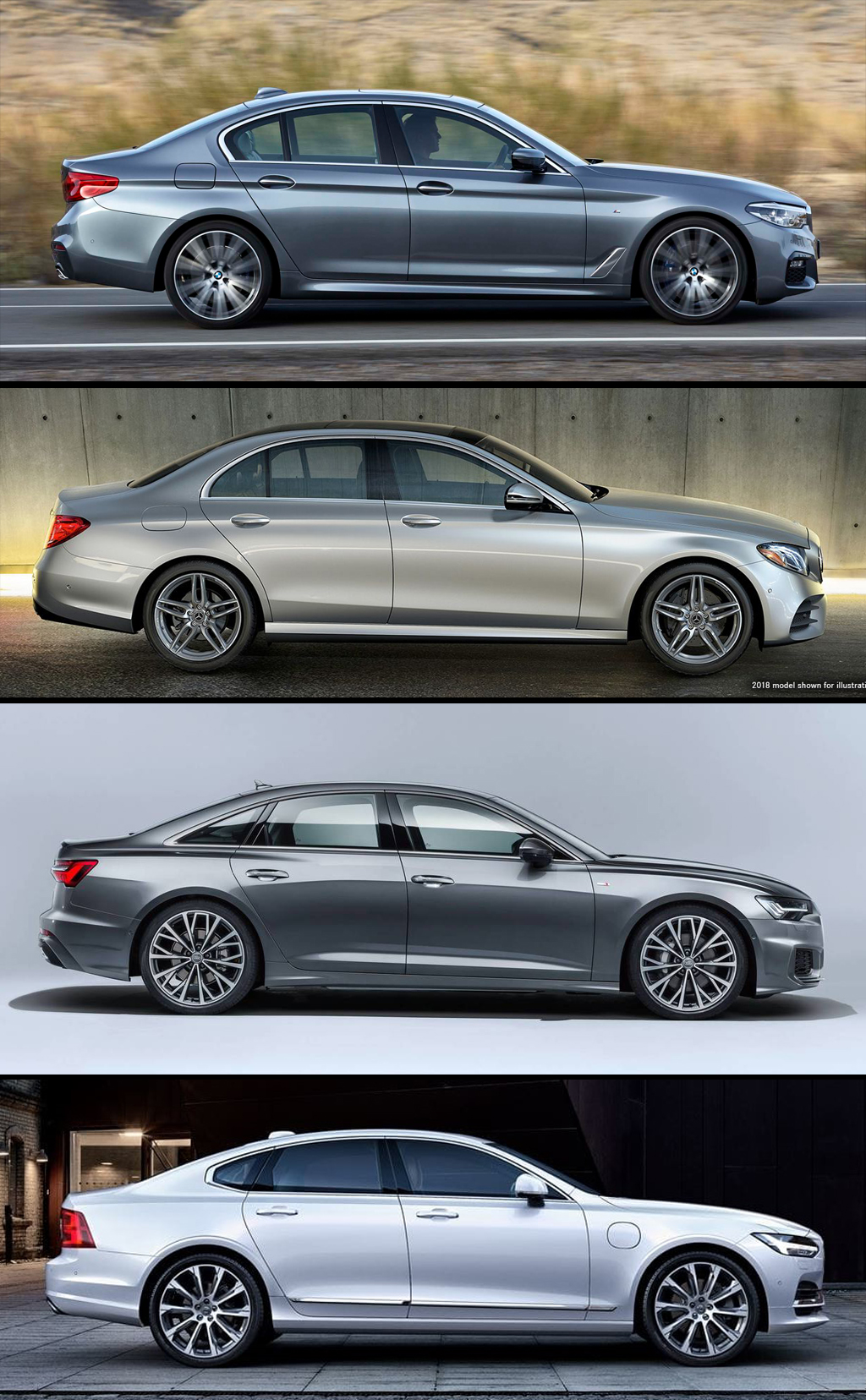 Những điểm nhấn tiếp theo ở phần thân xe là móc Hofmeister Kink ở cửa sổ hành khách, đường gân Character line chạy dọc thân xe và khe thoát gió “Air Breather” chạy song song với đường gân chính. Dưới con mắt thẩm mỹ của tôi thì BMW Series 5 là chiếc xe có thiết kế kinh điển, “chuẩn chỉ” và đẹp nhất trong phân khúc sedan hạng sang cỡ E. Dưới đây là ảnh so sánh BMW Series 5 với các đối thủ cùng mâm.