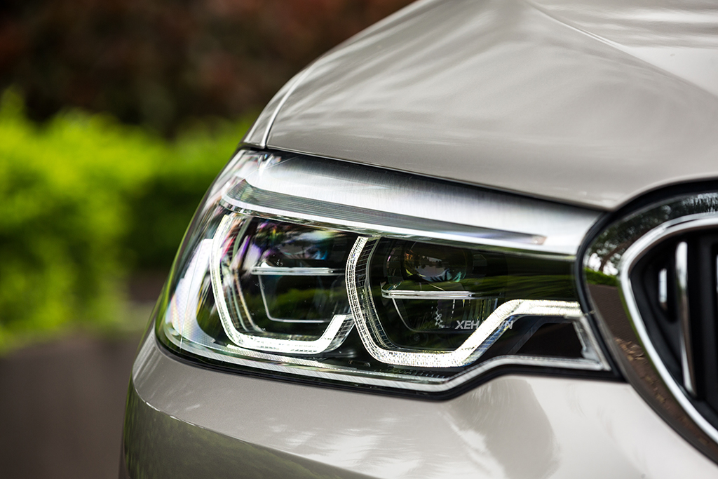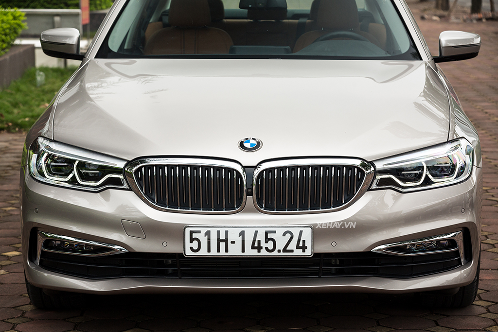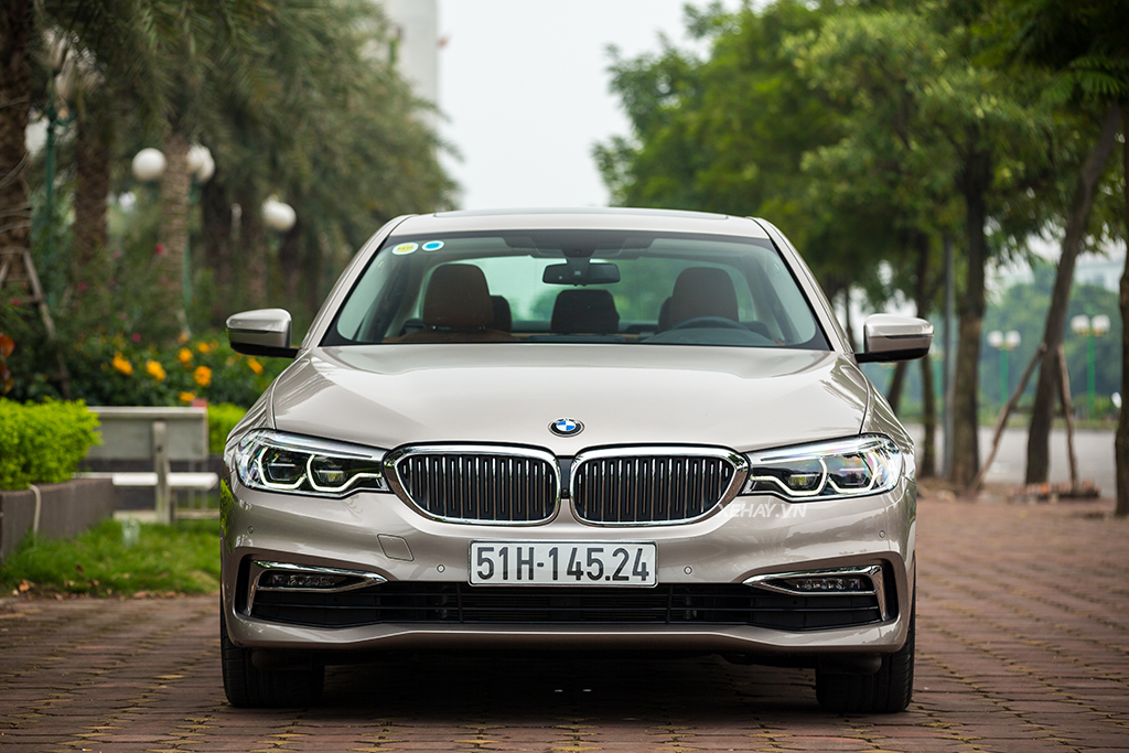 Chiếc Series 5 đời G30 dường như vẫn phảng phất dấu ấn của ông Karim ở chỗ: nó không thu hút ánh nhìn bằng những chi tiết gây sốc (ví dụ như mặt ca lăng của Series 4), thay vào đó là một thiết kế dù tinh giản nhưng đầy uy lực. Vẫn là mặt ca lăng hình quả thận đặt ngang và 4 cụm đèn pha LED có kiểu dáng truyền thống, gương mặt của BMW 530i toát nên vẻ “business” nhưng vẫn không kém phần thể thao. Thiết kế lấy bề ngang làm điểm nhấn đã tạo nên ấn tượng về một chiếc sedan thể thao cho 530i. So với bản 520i, 530i có đèn pha LED thích ứng không chỉ đẹp hơn mà còn có tính năng mở rộng chùm sáng và thay đổi góc chiếu để không gây ảnh hưởng đến xe ở làn đối diện.
