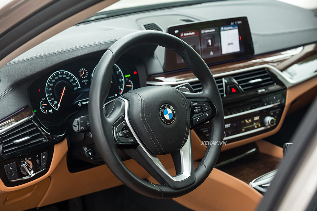 Vô lăng 530i có thiết kế tuyệt đẹp với viền bọc da nappa,khu vực túi khí cũng được thêu chỉ tương phản nhìn rất chỉn chu và tinh tế. Tuy nhiên, các nút bấm nhựa – dù rất chắc chắn và có chất lượng gia công tốt – nhưng không thể đẹp và sang chảnh như các nút bấm kim loại trên E-Class. Cũng giống như đối thủ đồng hương, BMW 530i tại Việt Nam cũng thiếu đi các tính năng hỗ trợ người lái tiên tiến như Kiểm soát hành trình thích ứng hay Hỗ trợ giữ làn. Đây là thiếu sót khá đáng tiếc vì những tính năng này là không quá đắt tiền (ở nước ngoài) và giờ đây, rất nhiều mẫu xe bình dân đã được trang bị tại Việt Nam.