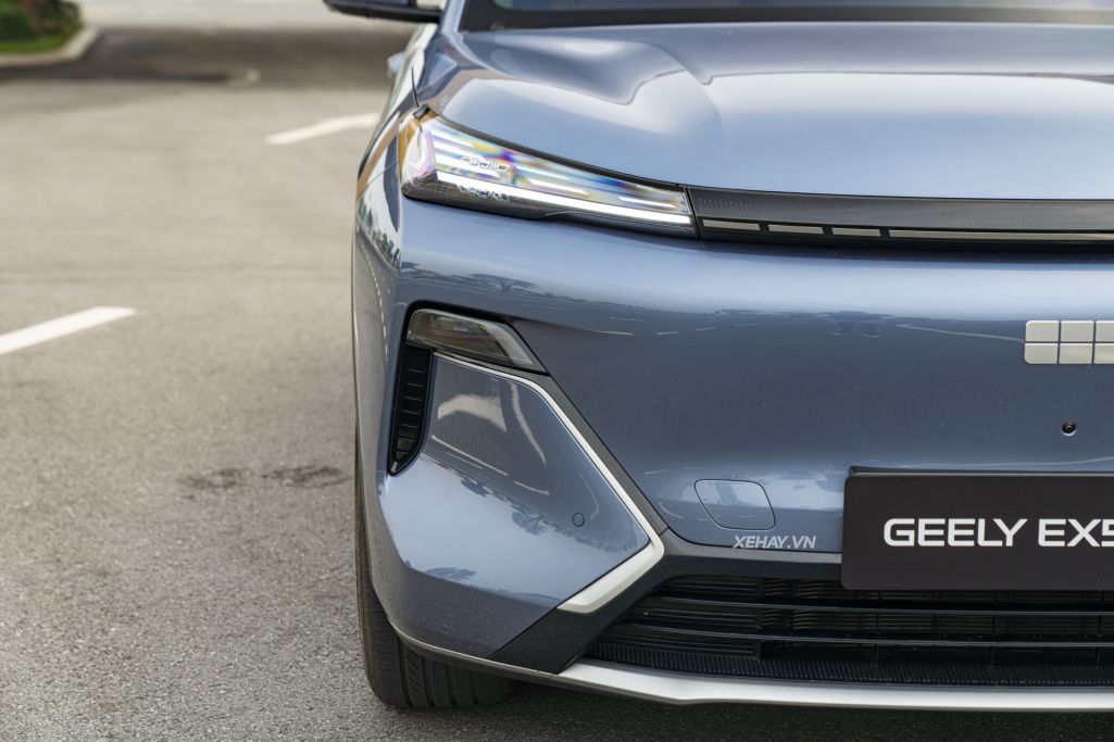 So với bản thuần điện, EX5 EM-i có phần đầu xe được tinh chỉnh theo hướng cứng cáp hơn, với các mảng cắt xẻ ở cản trước giúp tổng thể trông rộng và “đằm” hơn khi nhìn trực diện. Cụm đèn LED thanh mảnh nối liền tạo cảm giác hiện đại, nhưng không quá cầu kỳ.