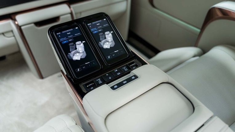 Khác với các dòng xe châu Âu thường lạm dụng đèn viền nội thất hay trần sao, nội thất của LM đi theo hướng tối giản và tĩnh tại. Các hộc chứa đồ, bàn làm việc gấp gọn, cổng sạc không dây và tủ lạnh đều được ẩn giấu khéo léo sau những tấm ốp cao cấp. Hai ghế sau có khả năng ngả phẳng hoàn toàn, tích hợp đầy đủ các tính năng massage, sưởi ấm tựa tay và bệ tì chân, được điều khiển qua hai thiết bị cầm tay thông minh đặt tại bệ trung tâm.