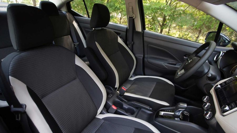 Không có da thật được dùng trong cabin Nissan Versa 2020, dù là bản SR cao cấp cũng chỉ có tùy chọn vải, kết hợp da bò giả ở các tấm ốp cửa, mặt táp-lô...nhưng nó cũng đủ mềm, mịn và mang lại cảm giác khá thật. Xe được trang bị ghế Zero Gravity, đi kèm khá nhiều thành phần làm tự nhựa cứng tổng hợp như trên cửa và bảng điều khiển.