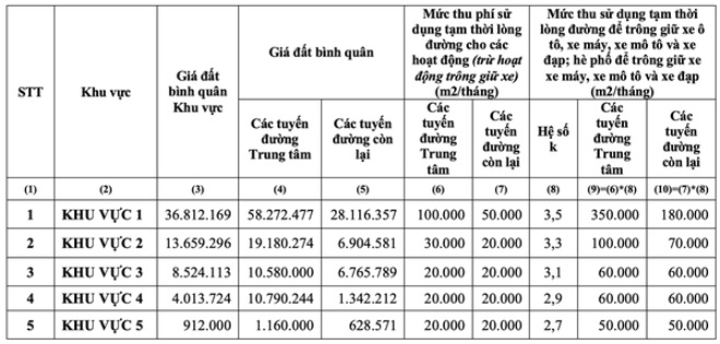 Ngoài ra mức phí cho thuê lòng đường, vỉa hè cho các hoạt động khác có giá 20.000 - 100.000 đồng/m² tùy từng khu vực.