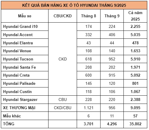 Ngày 15/10/2025, Tập đoàn Thành Công (TC GROUP) thông báo kết quả bán hàng tháng 9/2025. Theo đó, tổng doanh số xe Hyundai tháng 9 đạt 4.296 xe, tăng trưởng 16,1% so với tháng 8.