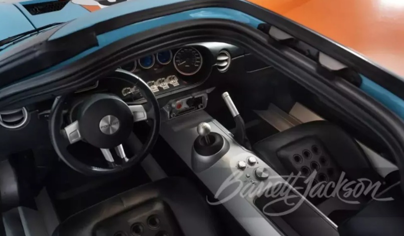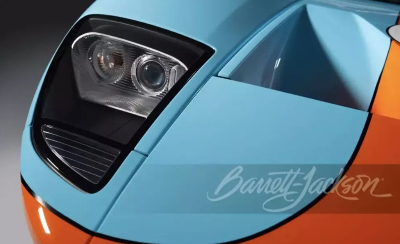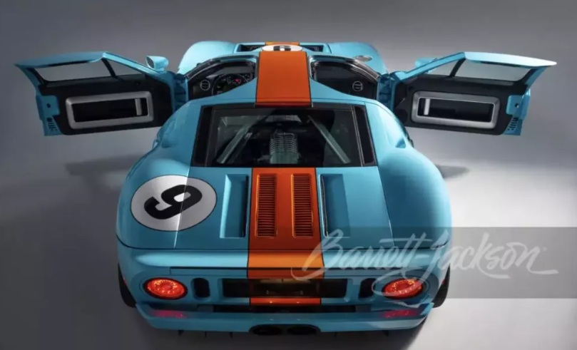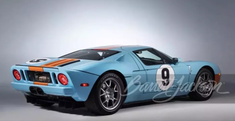 Chiếc GT Heritage khoác lên mình tông màu Gulf Blue và Orange huyền thoại, đi kèm các chi tiết đặc trưng như sọc đua cam, vòng tròn trắng và huy hiệu di sản, khác biệt hoàn toàn so với các mẫu Ford GT tiêu chuẩn.