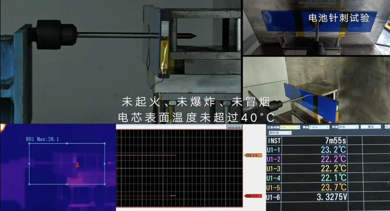 Kết quả tương tự cũng đạt được khi ngâm bộ pin vào nước biển. Với việc thả rơi từ ba phía và va đập mạnh, pin sau đó được để trong 2 giờ mà không có bất kỳ phản ứng nào. Không dừng lại ở đó, đây còn là loại pin đầu tiên trên thế giới vượt qua thử nghiệm bắn xuyên bằng đạn thật 5,8mm. Ngay cả khi bị viên đạn bắn với tốc độ 920m/s tạo ra vết nứt có đường kính lớn hơn 60mm, pin vẫn không phát nổ hay bốc cháy. Các bài kiểm tra khác cũng được thông qua tương tự với thành tích xuất sắc.