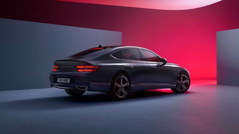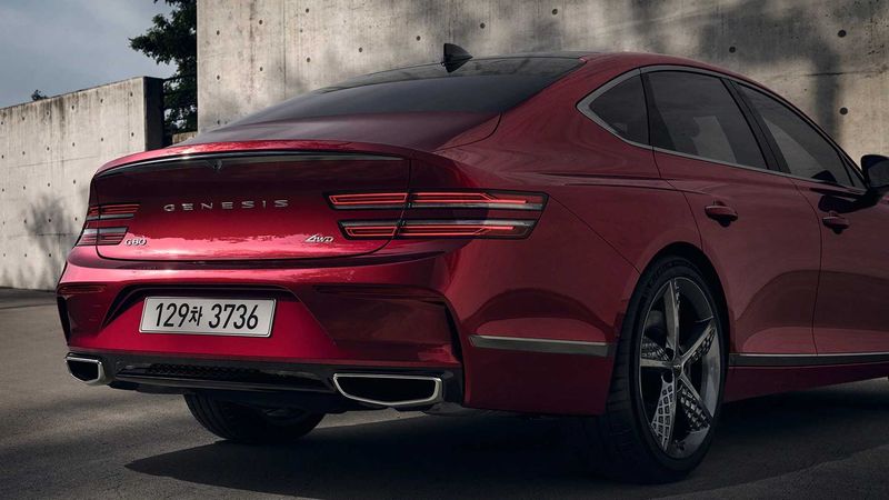 Vòng ra phía đuôi, chiếc seadn thể thao có cản sau mới, bộ khuếch tán thiết kế lại và ống xả kép hình lưới tản nhiệt Crest Grille đặc trưng của thương hiệu (trên bản xăng). Genesis G80 Sport 2022 được cung cấp với màu sơn đỏ độc quyền Cavendish Red.