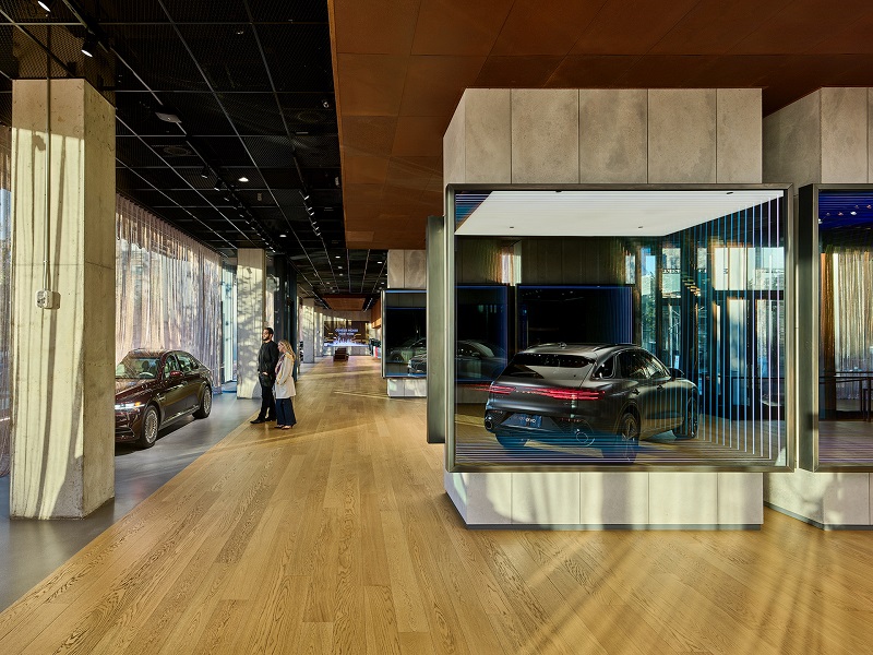 Phòng trưng bày ở tầng trệt Genesis House mang đến cho khách hàng cơ hội trải nghiệm những mẫu xe Genesis mới nhất trong một không gian rộng rãi. Những chiếc xe tại đây đều được bao quanh bởi nhiều tấm gương lớn nhằm khuếch đại sự tinh xảo trong chế tác và sự hoàn hảo về mặt cơ khí.