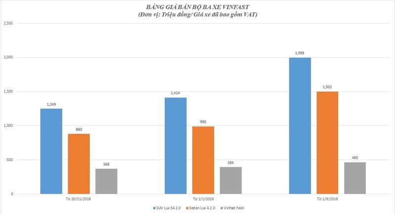 Cũng trong tháng 1/2019, VinFast sẽ tiến hành điều chỉnh giá bán cho cả 3 mẫu ôtô của mình. Theo đó, giá xe sedan Vinfast Lux A 2.0 tăng thêm 100 triệu đồng, từ 800 triệu đồng/xe lên mức giá 900 triệu đồng/xe.