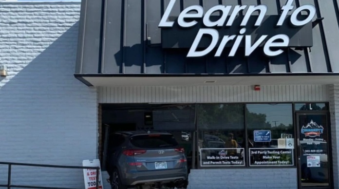 Mới đây, một tài khoản mạng xã hội đã bất ngờ đăng tải bức ảnh chiếc SUV “nằm gọn” trong cửa trung tâm dạy lái "Learn to Drive" ở Đại lộ Wadsworth tại phía bắc thành phố Denver.