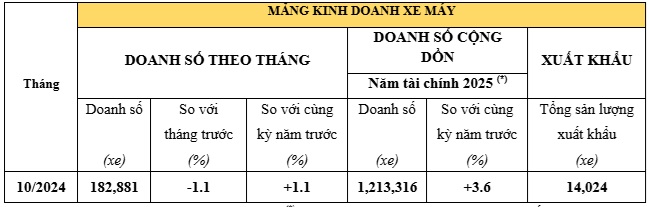 Theo đó, tháng 10/2024 vừa qua, Honda ghi nhận doanh số bán xe máy đạt 182.881 xe, giảm 1.1% so với tháng trước và tăng 1.1% so với cùng kỳ năm trước. Tổng sản lượng xuất khẩu xe máy của HVN là 14.024 xe.