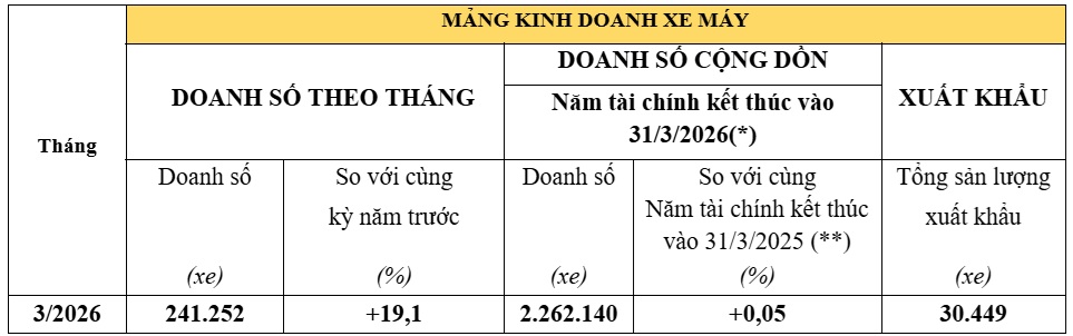 Theo đó, kết thúc tháng 3 vừa qua, Honda Việt Nam ghi nhận doanh số xe máy đạt 241.252 xe, tăng 19,1% so với cùng kỳ tháng 3 năm 2025.