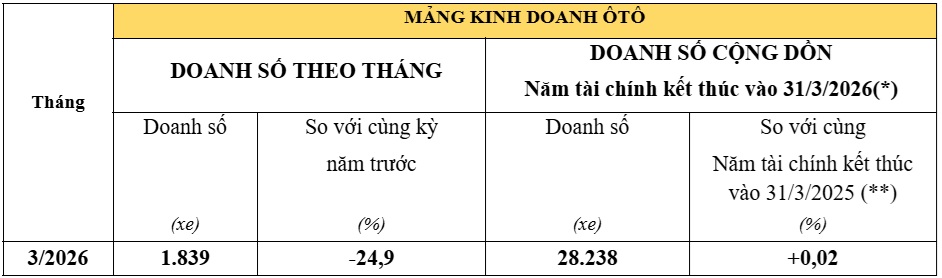 Tổng doanh số cả năm tài chính kết thúc vào 31/3/2026 là 28.238 xe, tăng 0,02% so với năm tài chính kết thúc vào 31/3/2025.