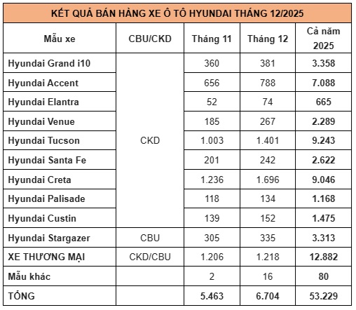 Doanh số bán hàng các mẫu xe Hyundai trong tháng 12/2025 (Đơn vị: Xe)