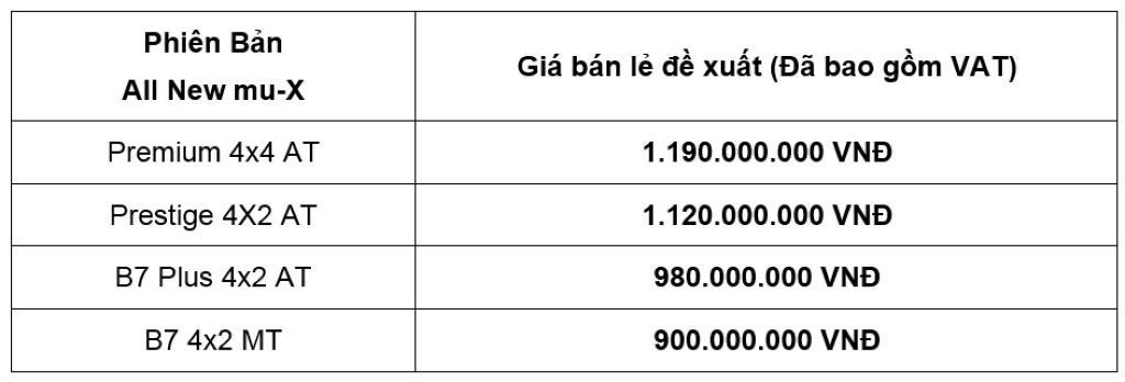 All New mu-X ra mắt với mức giá hấp dẫn như sau: