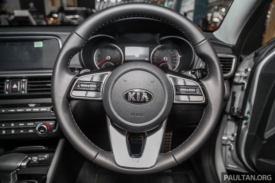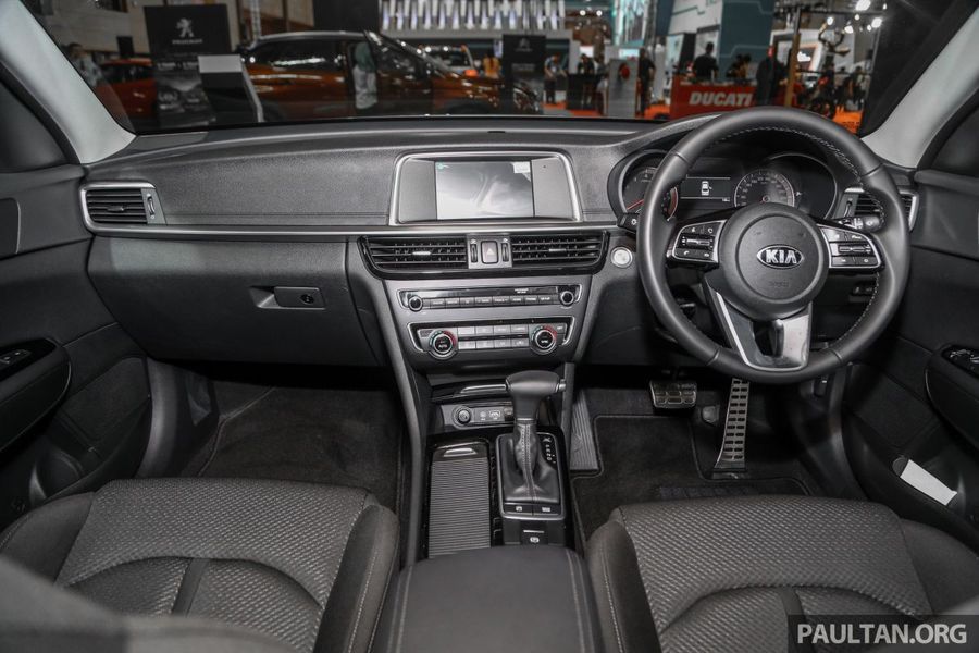 Tuy nhiên, khi bước vào không gian nội thất, Kia Optima bản EX tại Malaysia sẽ gây "khó chịu" cho người Việt bởi bộ ghế bằng vải thay vì bằng da hay nỉ như thường thấy. Kia Optima bản EX này được trang bị khá nhiều option phục vụ người dùng như ghế lái chỉnh điện hỗ trợ chức năng nhớ vị trí, phanh tay điện tử + Auto Hold, chìa khóa thông minh với nút bấm khởi động, hệ thống thông tin giải trí kích thước 7 inch trung tâm hỗ trợ kết nối với Android Auto/ Apple CarPlay, ngoài ra màn hình này cũng tích hợp chế độ xem xung quanh 360 độ...