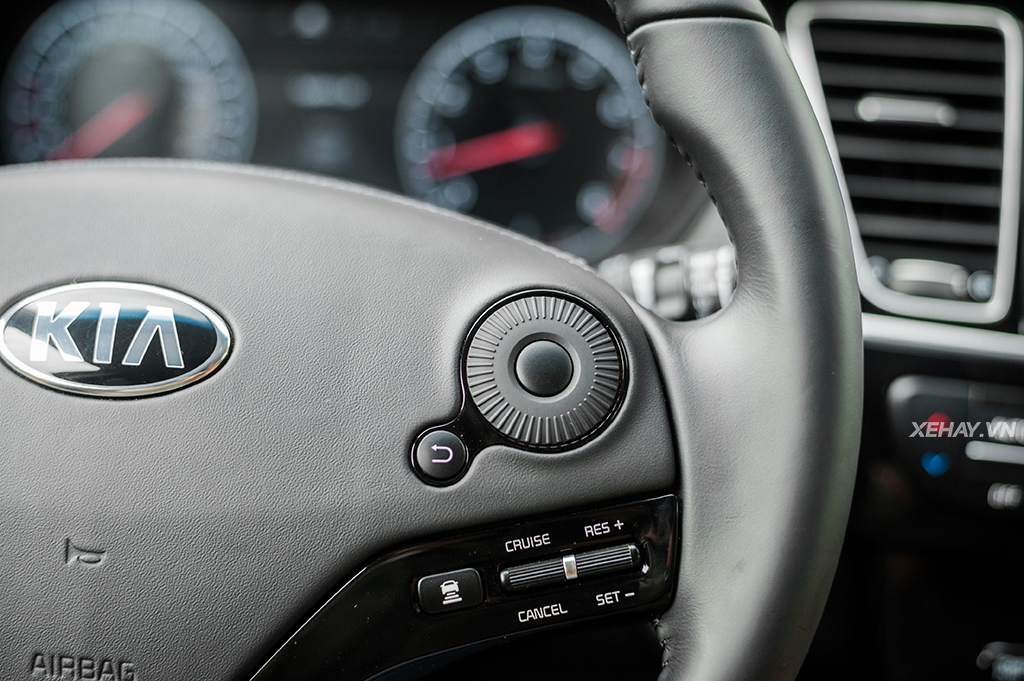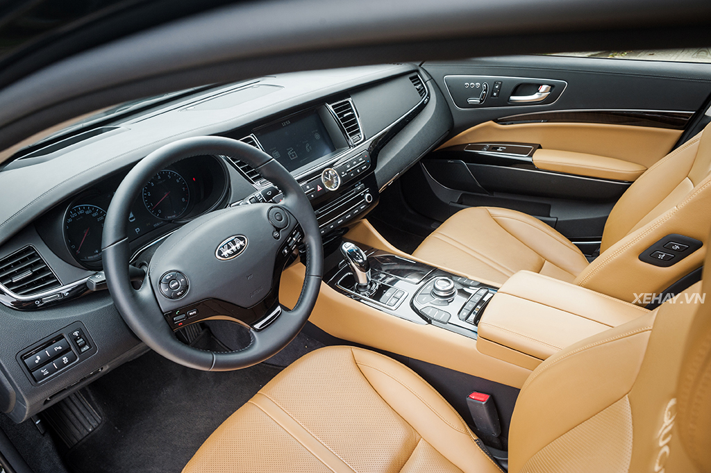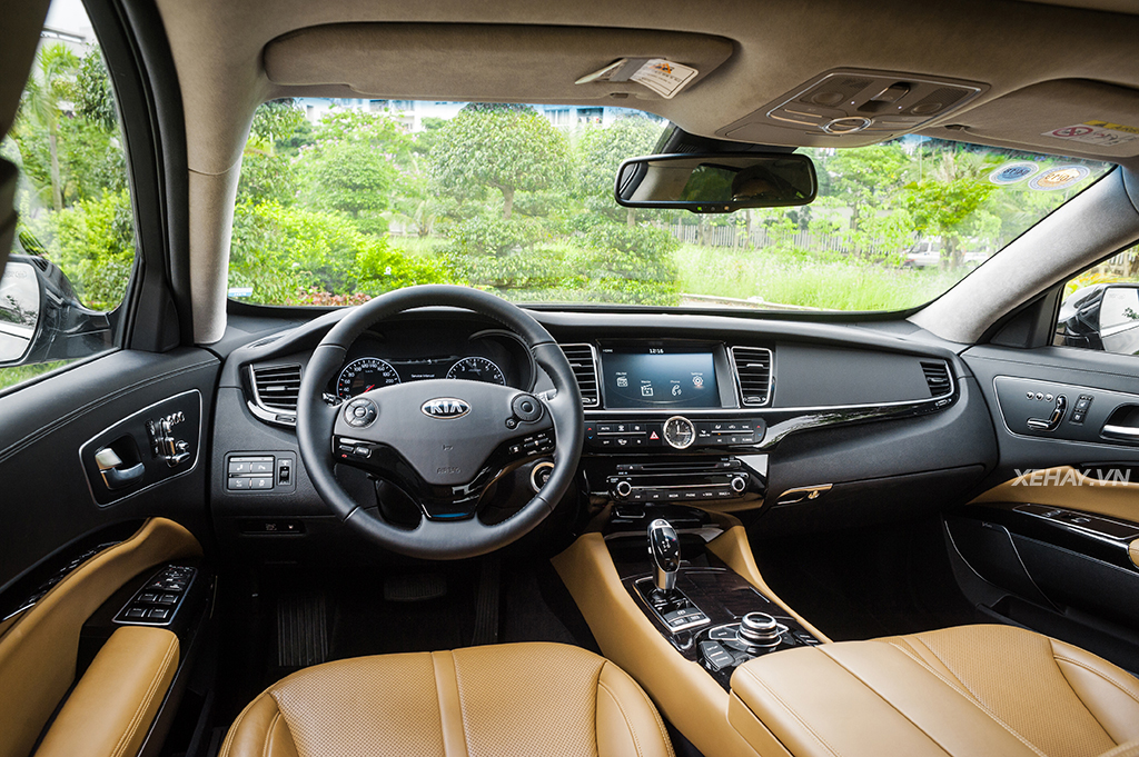 Ở bên trong cabin, Kia Quoris rộng hơn rất nhiều so với E-Class hay 5 Series, nhất là khoảng không gian dành cho hàng ghế sau, nhưng nhiều chi tiết vẫn chưa được chăm chút đúng mực. Xe được trang bị vô lăng 3 chấu được bọc da và ốp nhựa đen có thiết kế hao hao vô lăng của những chiếc Mercedes-Benz đời W221. Phím điều hướng và vòng xoay cao su ở vị trí ngón tay cái ở bên phải vô lăng cũng không mang lại cảm giác tôi đang cầm lái một chiếc xe sang. Những nút bấm, những chi tiết nhựa không được trau truốt và sắc sảo như trên các mẫu xe châu Âu và đáng tiếc là bảng táp lô không được ốp gỗ, thay vào đó là một miếng nhựa đen giống như nhiều mẫu xe cấp thấp khác của Kia.