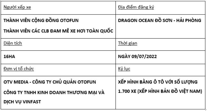 Với sự đồng hành đơn vị đồng tổ chức là Công ty TNHH Thương mại và Dịch vụ VinFast, sự hỗ trợ của Ban quản lý Khu Du lịch quốc tế Đồi Rồng (Dragon Ocean Đồ Sơn), sự ủng hộ của UBND Quận Đồ Sơn, OTV Media - đơn vị chủ quản Cộng đồng Otofun, đã quyết tâm thực hiện thành công chương trình kỷ lục có tầm cỡ thế giới.