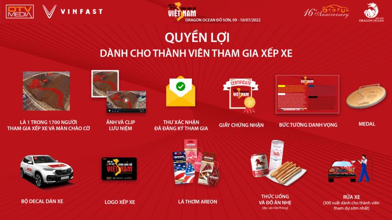 Sau hai năm chuẩn bị, Chương trình Xếp xe Kỷ lục Hình Bản đồ Việt Nam chính thức diễn ra vào ngày 09/07/2022, tại Khu Du lịch Quốc tế Đồi Rồng - Đồ Sơn, Hải Phòng. Chương trình dự kiến sẽ xác lập kỷ lục “Xếp hình bằng ô tô nhiều nhất” và “Đoàn diễu hành bằng ô tô nhiều nhất”, được công nhận bởi Tổ chức Kỷ lục Việt Nam.