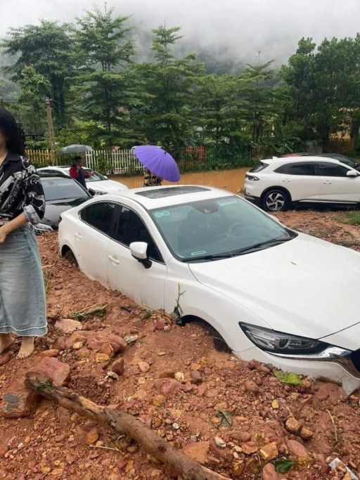 Tại hiện trường, nhiều phương tiện là của khách tới nghỉ dưỡng bị bùn đất lấp gần hết mặt ca lăng, mắc kẹt, "chôn chân" tại chỗ.