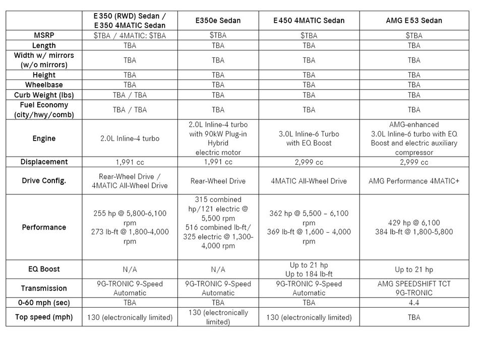 Những người Mỹ sẽ có thể sở hữu chiếc E350 với động cơ Turbo 2.0 lít 255 mã lực trên cả hai phiên bản dẫn động RWD và 4Matic AWD, chiếc E350e PHEV với động cơ Turbo 2.0 lít 315 mã lực và một mô-tơ điện, chiếc E450 4Matic với 362 mã lực từ động cơ Turbo I6 3.0 lít mới với những nâng cấp trên EQ và cuối cùng là chiếc AMG E53 với động cơ sáu xi-lanh thẳng hành, dung tích 3.0 lít và công suất 429 mã lực, kết hợp cùng một máy nén điện. Theo kế hoạch, các phiên bản sedan sẽ được mở bán vào cuối năm 2020.
