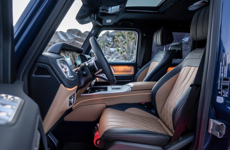 Khoang cabin của G 500 không khác biệt nhiều so với G 63. Xe vẫn sở hữuhai màn hình 12,3 inch, đèn viền nội thất 64 màu, hệ thống âm thanh Burmester, điều hòa tự động ba vùng, cửa sổ trời cùng ghế sưởi/làm mát cho hàng trước.