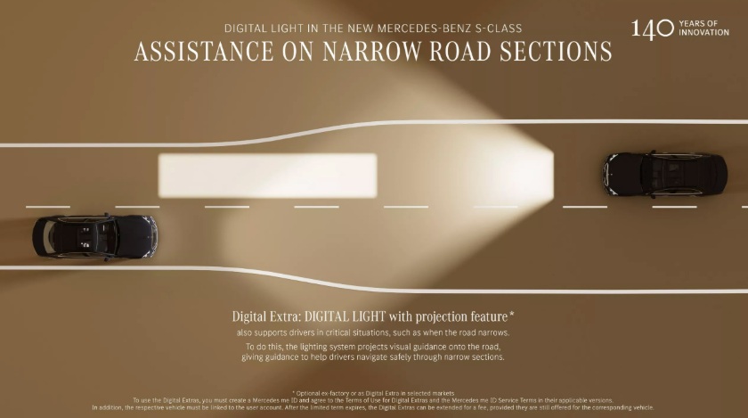 Vượt xa chức năng chiếu sáng thông thường, gói tùy chọn Digital Extras biến mặt đường thành một màn hình hiển thị sống động. Hệ thống có thể chiếu các ký hiệu cảnh báo trực tiếp xuống đường như biển báo ngược chiều, cảnh báo chệch làn hay biểu tượng bông tuyết khi gặp đường trơn trượt. Thậm chí, khi đi vào các khu vực đang thi công, xe sẽ tự kích hoạt chế độ chiếu sáng làn đường hẹp để hỗ trợ người lái. Để tăng thêm tính cá nhân hóa, chủ nhân còn có thể tận hưởng các hiệu ứng ánh sáng động như "Digital Rain" hay "Star Wave" mỗi khi khóa hoặc mở cửa xe.