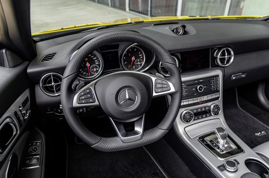 Di chuyển vào trong, SLC 300 Final Edition được trang bị ghế bọc da Nappa hai tông, các dây đai an toàn màu xám, các điểm nhấn bằng da màu carbon, viền nhôm sáng, vô lăng đáy phẳng và thảm sàn đặc biệt. Các tính năng đáng chú ý khác gồm có ghế ngồi có sưởi, hệ thống sưởi vùng cổ AIRSCARF và rất nhiều huy hiệu “Final Edition” xuất hiện quanh xe.