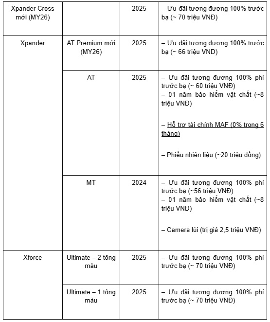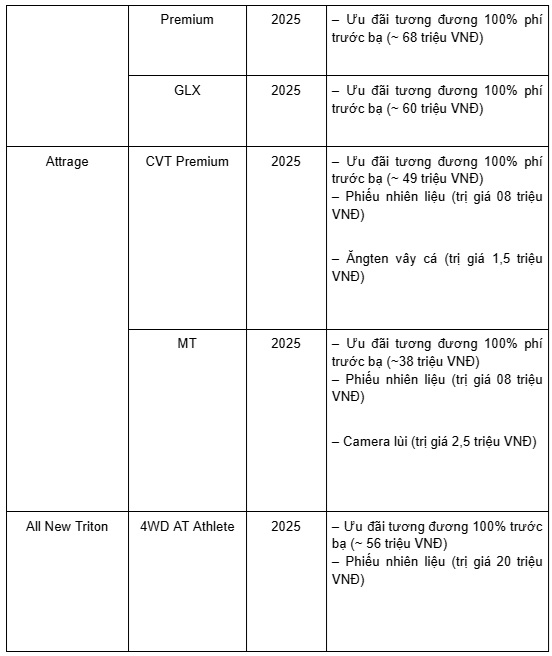 Bên cạnh Destinator, Mitsubishi cũng triển khai loạt ưu đãi đáng chú ý dành cho các dòng xe hiện hành, với điểm nhấn là 100% lệ phí trước bạ cho nhiều mẫu xe bán chạy.