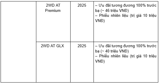 Ngoài ra, khi mua phiên bản MT hoặc AT, khách hàng còn nhận thêm: camera lùi, phiếu nhiên liệu, bảo hiểm vật chất hoặc ưu đãi lãi suất 0% trong 6 tháng, tuỳ mẫu xe. Tổng ưu đãi quy đổi tối đa lên đến 88 triệu đồng.