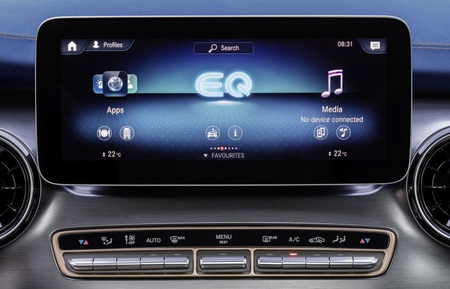 Các tính năng công nghệ đáng chú ý của EQV gồm có hệ thống thông tin giải trí MBUX, đó là một màn hình cảm ứng phân giải cao 10 inch tích hợp nhiều chức năng kết nối sáng tạo và có thể được điều khiển qua giọng nói.
