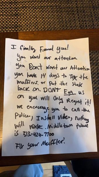Mới đây, một người dùng facebook có tên Aaron Robinson đã đăng tải lên trang cá nhân hình ảnh về hệ thống ống xả của chiếc Ford Mustang trong tình trạng chứa đầy bọt xốp, kèm theo đó là một bức thư tay với nội dung bày tỏ sự nóng giận của người hàng xóm do phải chịu đựng những âm thanh ầm ĩ từ chiếc Mustang mỗi ngày.
